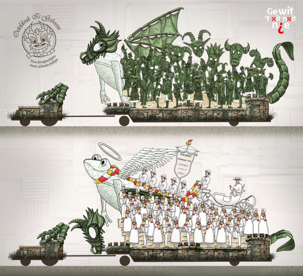 De 𝐛𝐫𝐚𝐬𝐩𝐚𝐫𝐭𝐢𝐣𝐞𝐧 zijn verbeeld als een ‘draak van een carnaval’. Ze steken de draak met de machthebbers en dit refereert ook naar de bijnaam van Den Bosch: de Moerasdraak.